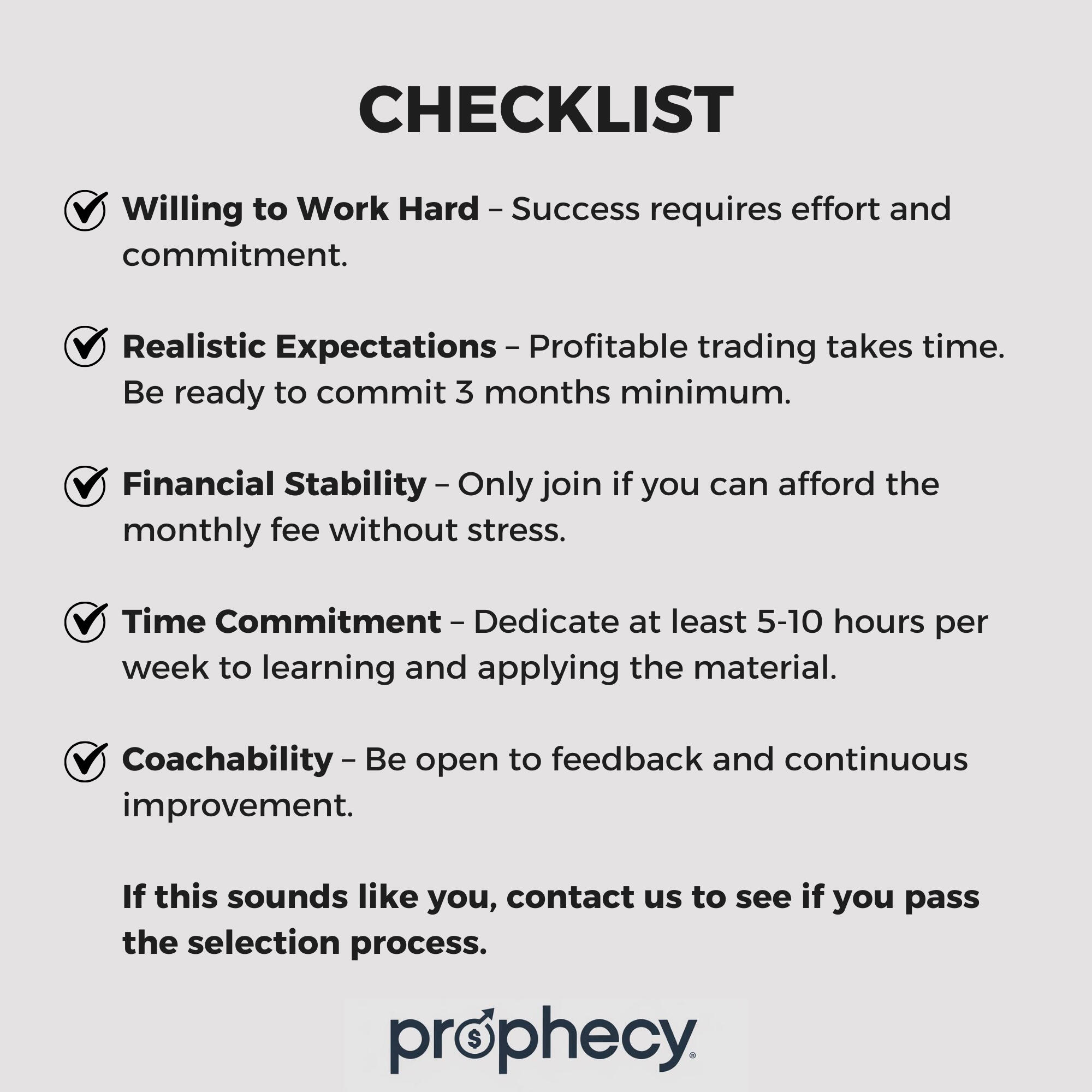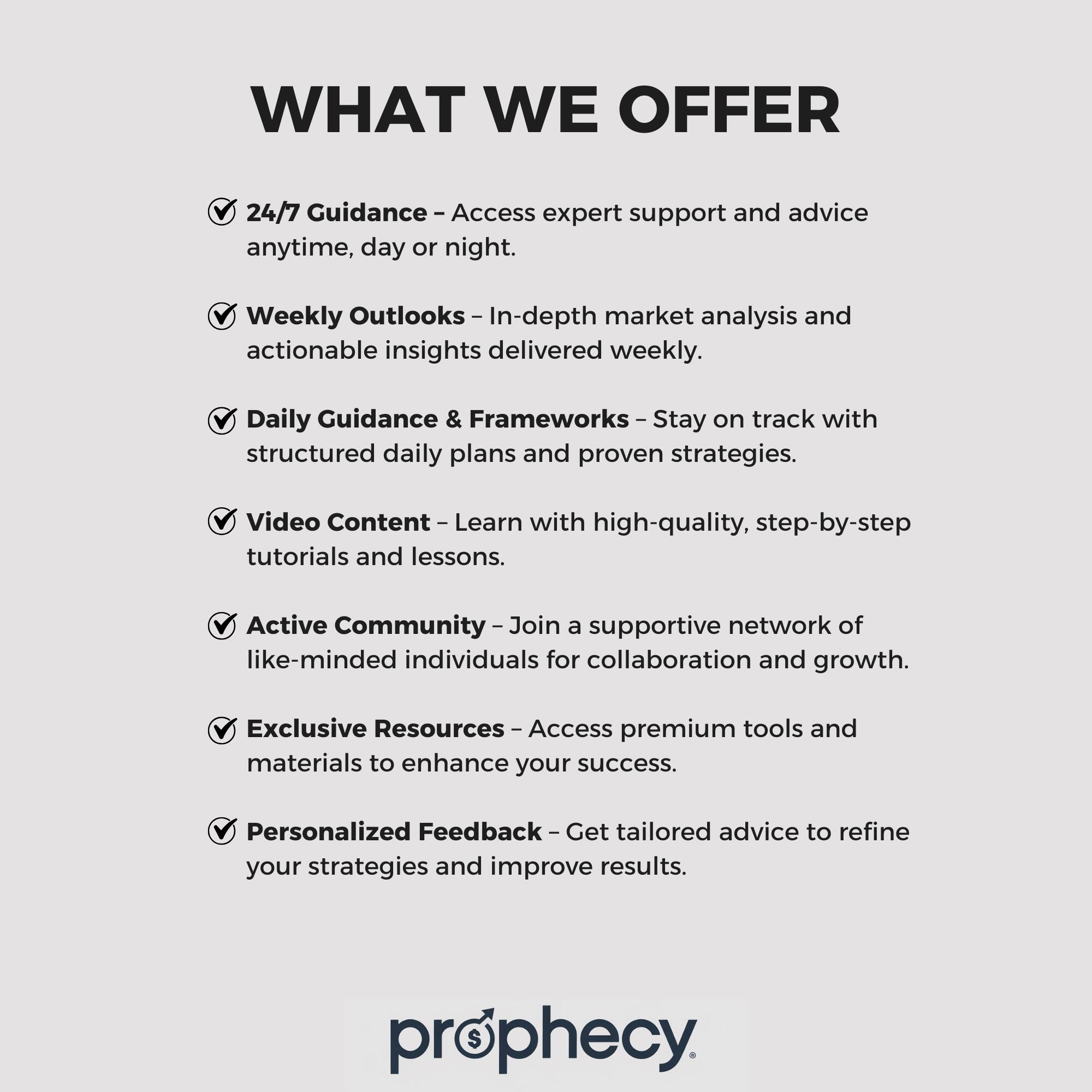 At Prophecy, we offer everything you need to succeed: 24/7 guidance to answer your questions anytime, weekly outlooks to help you stay ahead with expert insights, and daily guidance with proven frameworks for confident decision-making. Dive into our extensive library of video content for step-by-step tutorials and lessons, and become part of an active community where like-minded individuals share ideas, support, and growth. With us, you’ll have the tools, knowledge, and network to achieve your goals seamlessly.